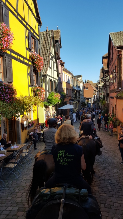 Sie können durch die schönste Dörfer im Elsass reiten (Riquewihr, Eguisheim,…) mit ihren wunderschönen blumenbeschmückten Fachwerkhäusern und mit ihren wunderschönen Sandsteinbrunnen, die als Pferdetränke auch sehr beliebt sind. Selbstverständlich kann man die eine oder andere Weinprobe machen!